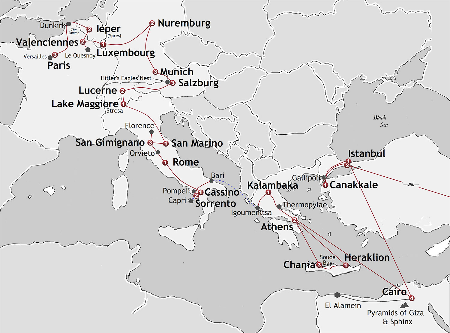 - Pay tribute at some of Europe's major WW1 & 2 theatres of war, where ANZAC troops fought leaving many dead and buried, or commemorated. Join a guided tour of some major battlefields, as well as visit Commonwealth War Cemeteries, including Gallipoli in Turkey, El Alamein in Egypt, Souda Bay in Crete, Cassino in Italy, Passchendaele in Belgium, and the Somme in France.Attend the daily Menin Gate Last Post Ceremony in Ypres, and visit the NZ Liberation Museum in Le Quesnoy.Visit Hitler's Eagles Nest in the Bavarian Alps; Medieval Nuremburg, where the Nazi Rallies were held, as well as the War Trials; and be reminded of the horrors of Dachau Concentration Camp.Spend a night on the shores of the beautiful Lake Maggiore in the stunning Italian Lakes District.Compare and contrast the Mosques of Istanbul, the Pyramids and Sphinx of Cairo, the Acropolis in Athens, with Rome's Colosseum, and the myriad Cathedrals and Palaces of Europe, all of which date back centuries.Visit some of the smallest states in the World: Leichtenstein, Luxembourg, Vatican City, and San Marino.Marvel at the towns and fortresses wrapped around rocky hilltops, such as Kalambaka, Orvieto, San Gimignano, San Marino and Salzburg.See the ruins of Pompeii, a UNESCO World Heritage site, once buried for centuries under the ashes of a 79AD eruption of nearby Mt Vesuvius.Revel in the exquisite art of the Renaissance period in Florence, and maybe shop for leather goods and jewellery, which the city is also renowned for. Many famous Italians lived, died, and are buried here.Finish the tour with style in Paris, the City of Lights, with its wide boulevards, lined by boutique fashion houses, art galleries, entertainment venues, cafes and famous landmarks.
